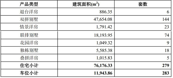 頤明園項(xiàng)目分為兩期工程進(jìn)行開(kāi)發(fā)建設(shè)。項(xiàng)目一期工程,主要為職工配套住宅用住宅,用地面積約為567.013畝,建筑面積310,525.85m2,分為春花里、夏溪里、秋實(shí)里、冬青里四個(gè)區(qū)域,包括住宅1,638套,可分為退臺(tái)洋房、雙拼別墅、情景洋房、聯(lián)排別墅、花園洋房、獨(dú)棟別墅、疊拼洋房等7種產(chǎn)品類(lèi)型;車(chē)位1,112個(gè);配套用房66套;幼兒園1所。截止至評(píng)估基準(zhǔn)日一期項(xiàng)目已建成完工,未竣工結(jié)算,已售住宅1359套,已售停車(chē)位829個(gè),未售完的住宅279套,未售完的停車(chē)位283個(gè),未售完的存量資源的情況如下表: