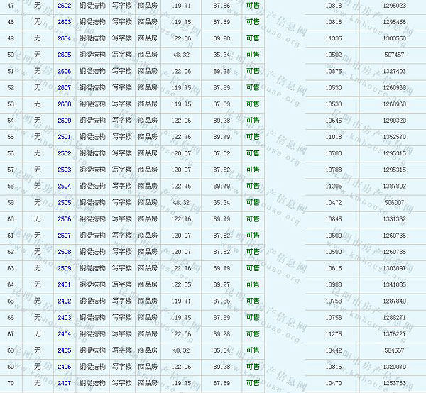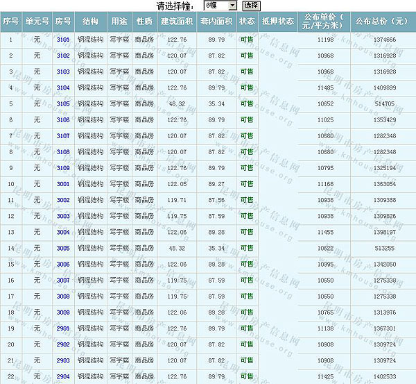 根據(jù)云南省物價(jià)局關(guān)于發(fā)布《云南省商品房銷售明碼標(biāo)價(jià)實(shí)施細(xì)則(試行)》的通知,現(xiàn)將該項(xiàng)目商品住房的準(zhǔn)售房源及每套房屋價(jià)格向社會(huì)公布,房地產(chǎn)開發(fā)企業(yè)應(yīng)嚴(yán)格按照公布價(jià)格,商品房銷售明碼標(biāo)價(jià)實(shí)行一套一標(biāo)。商品房經(jīng)營者應(yīng)當(dāng)對每套商品房按照建筑面具進(jìn)行明碼標(biāo)價(jià),否則,房產(chǎn)登記機(jī)關(guān)不予登記備案。準(zhǔn)售房源及房價(jià)信息如下:
