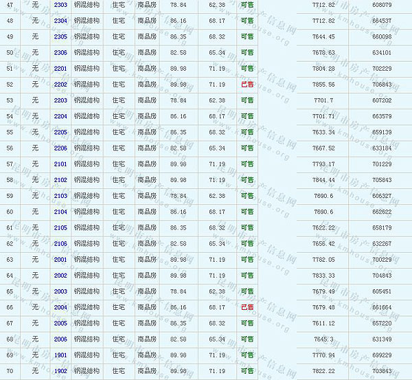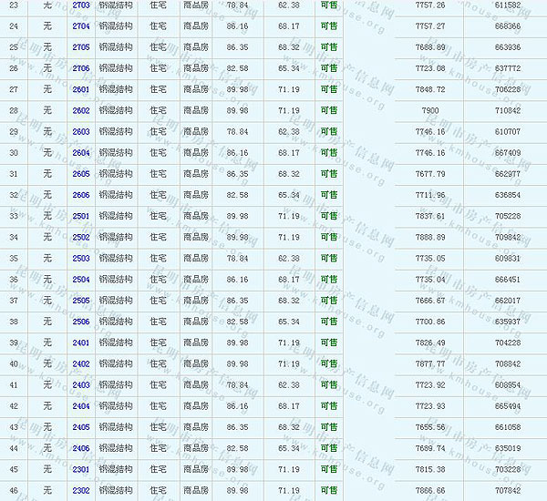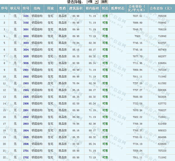 根據(jù)云南省物價局關(guān)于發(fā)布《云南省商品房銷售明碼標(biāo)價實施細(xì)則(試行)》的通知,現(xiàn)將該項目商品住房的準(zhǔn)售房源及每套房屋價格向社會公布,房地產(chǎn)開發(fā)企業(yè)應(yīng)嚴(yán)格按照公布價格,商品房銷售明碼標(biāo)價實行一套一標(biāo)。商品房經(jīng)營者應(yīng)當(dāng)對每套商品房按照建筑面具進(jìn)行明碼標(biāo)價,否則,房產(chǎn)登記機(jī)關(guān)不予登記備案。準(zhǔn)售房源及房價信息如下:
