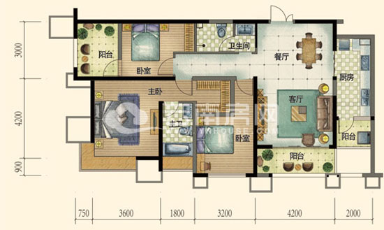 入門處便是客廳和餐廳,廚房位于客廳的一側(cè),呈長方形設(shè)計(jì)。廚房從與其相鄰的陽臺上采光。緊鄰客廳的,便是一個(gè)約4平米的景觀陽臺?托l(wèi)位于餐廳的一側(cè),從戶型圖上可以看出,衛(wèi)生間為干濕分離的設(shè)計(jì),這樣的設(shè)計(jì)有利于衛(wèi)生間保持干凈清爽。狹長的過道將客廳與臥室分開,三個(gè)臥室呈三角形分布,其中,主臥最靠里面一側(cè),自帶衛(wèi)生間和衣帽間,這樣的設(shè)計(jì)有利于保持主臥的私密性。與主臥相對的臥室?guī)б粋(gè)景觀陽臺,且采光通風(fēng)均需通過陽臺。