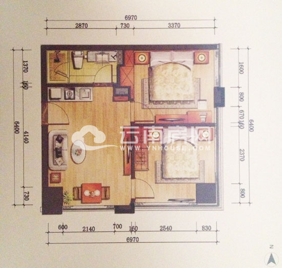 戶型B總面積約41.88平米,東西朝向,做成了通間的設(shè)計(jì)。格局方正,明亮實(shí)用,空間基本不浪費(fèi)。并且功能分區(qū)明晰,簡(jiǎn)單實(shí)用。廚衛(wèi)分離,生活空間能夠更加干凈、安全。能夠滿足商務(wù)住宿的基本需求。