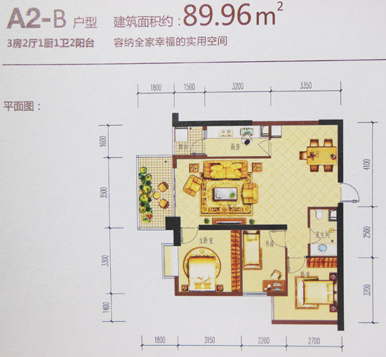 A2-B戶型建筑面積為89.96平米,戶型設(shè)計(jì)為三房二廳一廚一衛(wèi)二陽(yáng)臺(tái)。