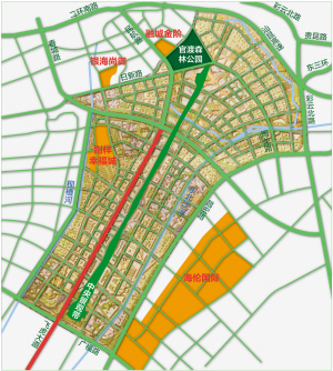 從目前能夠收集到的資料上看,中央景觀帶由人工河道和兩側(cè)的綠化帶構(gòu)成,這條景觀帶與平行縱向分布著的枧槽河、東白沙河構(gòu)成片區(qū)內(nèi)的水系景觀。