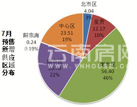 7月昆明預(yù)售供應(yīng)遍地開(kāi)花,覆蓋了主城4個(gè)分區(qū)與呈貢、陽(yáng)宗海,供應(yīng)主力區(qū)域是南市區(qū)、西市區(qū)與中心區(qū),其中南市區(qū)獲得8塊預(yù)售證,面積占比56.4%;西市區(qū)與中心區(qū)均獲得4塊預(yù)售證,面積占比分別為26.78%與23.51%。