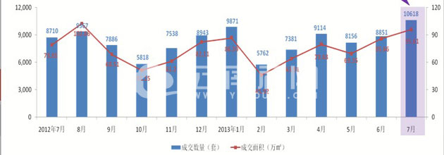 7月市場(chǎng)成交喜人,打破近兩年來(lái)備案套數(shù)未過(guò)萬(wàn)的尷尬,成交面積逼近百萬(wàn)方大關(guān)。