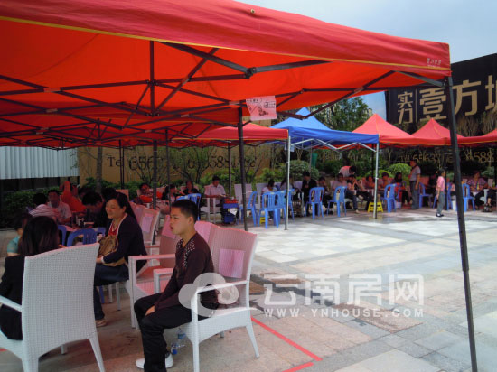 由于臺風(fēng)影響,昆明近日多雷陣雨天氣,實在不適合室外活動。然而當小編于(8月17日)下午1點30分左右來到項目售樓部時,長長的板凳隊伍早就排到了大門口。幸得開發(fā)商早早搭好了防雨棚和板凳,不然這樣的天氣排隊著實讓人吃不消。這時剛到現(xiàn)場的幾個客戶還開玩笑的說:“這房子是白送的么,這么多人排隊”。小編也對這樣的場面頗為迷惑,便一路走到售樓中心找置業(yè)顧問進一步了解情況,陸陸續(xù)續(xù)還有一些客戶的到訪。了解情況過后徑直走向排隊的隊伍末端。