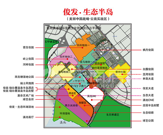 俊發(fā)生態(tài)半島總占地面積達(dá)到6700畝、群聚俊發(fā)近10個(gè)住宅項(xiàng)目、綜合配套各種城市休閑度假文化資源,是昆明城市運(yùn)營式開發(fā)占地最大的項(xiàng)目。整個(gè)俊發(fā)·生態(tài)半島項(xiàng)目毗鄰環(huán)湖東路半島區(qū)域,與巫家壩—五甲塘片區(qū)緊連,順承新亞洲體育城所在東南板塊直抵臨湖地帶,由高端住宅項(xiàng)目、星級酒店、濕地公園、主題公園、球藝公園、商業(yè)街區(qū)、國際學(xué)校等組成,是集運(yùn)動、休閑、度假、購物、居住為一體的高尚生活區(qū)域。
