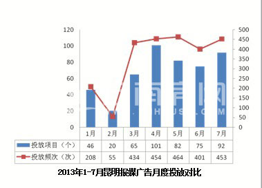 從2013年1-7月昆明平面媒體月度投放情況來看,自3月后媒體投放總體保持平穩(wěn)中震蕩前行,項(xiàng)目投放波動(dòng)較明顯。