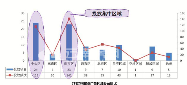 中、南領(lǐng)銜:從7月昆明媒體廣告區(qū)域投放情況來看,南市區(qū)和中心區(qū)的投放量最集中。其中中心區(qū)樓盤投放量僅高出南市區(qū)1個(gè)項(xiàng)目,項(xiàng)目投放占比分別為26.09%和25%;而南市區(qū)的報(bào)媒投放頻次遠(yuǎn)高出中心區(qū)26次,投放頻次占比分別為25.39%和31.13%。