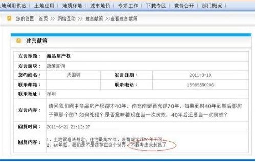 網(wǎng)友就四川閬中商品房產(chǎn)權(quán)只有40年一事咨詢閬中市國土局,其官方網(wǎng)站做出“40年后,我們是不是還存在這個(gè)世界,不要考慮太長遠(yuǎn)了”的官方“雷人回復(fù)”,引起媒體的廣泛關(guān)注和眾多網(wǎng)友吐槽。閬中市國土局通過中廣網(wǎng)及時(shí)做出回應(yīng),稱此回復(fù)“言語不當(dāng)”,并向網(wǎng)友公開致歉。2011年3月,有網(wǎng)友在閬中市國土局官方網(wǎng)站咨詢稱:“請問我們閬中商品房產(chǎn)權(quán)都才40年,南充、南部、西充都70年,如果到時(shí)40年到期后那房子算哪個(gè)的?如何處理?是否意味著現(xiàn)在當(dāng)一次房奴,40年后還要當(dāng)一次房奴?”對此提問,閬中市國土局在當(dāng)年6月份給予了回復(fù):“1。土地管理法規(guī)定,住宅最高70年,沒有規(guī)定非70年不可;2.40年后,我們是不是還存在這個(gè)世界,不要考慮太長遠(yuǎn)了!贝撕螅佒惺袊临Y源局通過其官方作出回復(fù):對工作人員就網(wǎng)絡(luò)咨詢土地出讓年限問題回復(fù)中出現(xiàn)言語不當(dāng)?shù)默F(xiàn)象,該局高度重視,深表歉意。經(jīng)局黨委會(huì)研究決定,對分管領(lǐng)導(dǎo)作出嚴(yán)肅批評,工作人員實(shí)行誡勉談話并責(zé)令作出深刻的書面檢討。