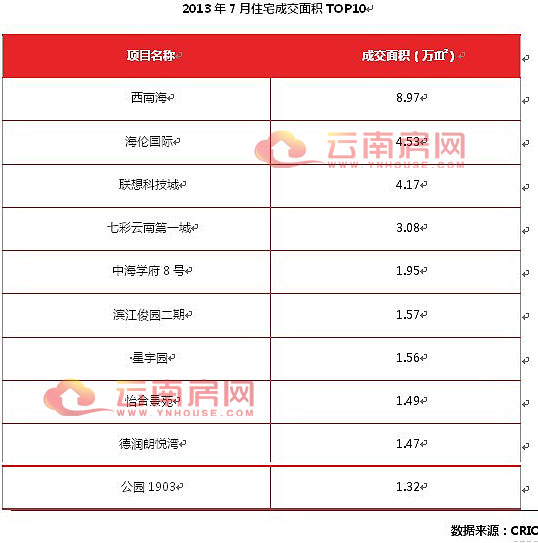 7月,住宅成交面積top10排行分別是西南海、海倫國際、聯(lián)想科技城、七彩云南第壹城、中海學府8號、濱江俊園二期、星宇園、怡合景苑、德潤朗悅灣、公園1903。