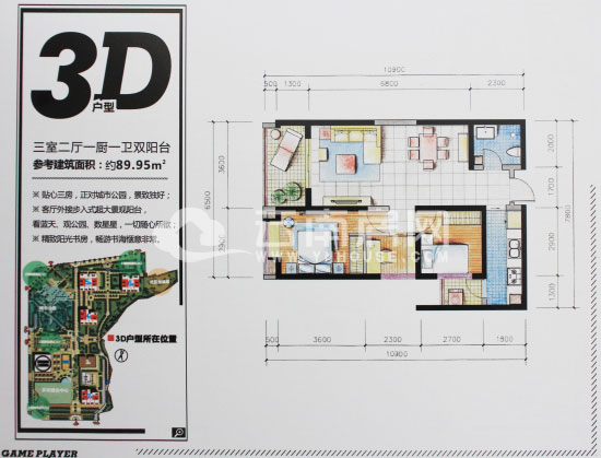 3D戶型三室二廳一廚一衛(wèi)雙陽臺(tái),被稱為緊湊三房,同屬水晶之戀房源,營(yíng)銷主題也是主打婚房。相比2A戶型,面積上相差不大,卻大大提高了空間利用率,擠出了三房雙陽臺(tái)。說他是緊湊三房在合理不過了。