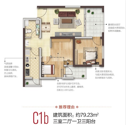 項目C1b79.23平米戶型為三室兩廳一衛(wèi)三陽臺設計創(chuàng)意潮居戶型,不到80平米的空間,設計包括有三個陽臺,可充分保證賞景及采光需求;三房設計舒適實用,私密性強,滿足兩口、三口之家的需求:主臥雙面采光,并且與超大景觀陽臺相連,空氣流通,采光面足;書房與次臥可開可合,亦可作為未來兒童房、健身房,增加可利用空間;廚房連接生活小陽臺,便于生活。