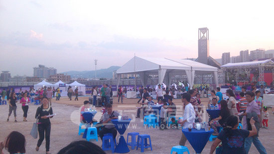 云南房網(wǎng)小編7點(diǎn)05分到達(dá)聯(lián)想科技城的售樓中心,路旁停滿(mǎn)了車(chē)輛。在工作人員引導(dǎo)下,我們來(lái)到活動(dòng)現(xiàn)場(chǎng),巨大的標(biāo)語(yǔ)宣傳橫幅、火紅的氣球和現(xiàn)場(chǎng)喧鬧的人群相得益彰,顯得異常熱鬧,F(xiàn)場(chǎng)門(mén)口,因?yàn)闃I(yè)主眾多,安保人員維持著秩序,擁有入場(chǎng)卷的業(yè)主才能進(jìn)入活動(dòng)現(xiàn)場(chǎng)。在經(jīng)過(guò)門(mén)禁簽到后,還有各色熒光棒和氣球派發(fā)。沿著紅毯往里走,一個(gè)小型兒童娛樂(lè)城堡,孩子們盡情撒歡。7點(diǎn)15分,活動(dòng)還沒(méi)有開(kāi)始,現(xiàn)場(chǎng)已經(jīng)座無(wú)虛席,人們?cè)诰扑畢^(qū)和小吃區(qū)排成長(zhǎng)龍領(lǐng)取啤酒飲料和美食,在享受清涼啤酒沒(méi)事的同時(shí),還可以享受美妙的音樂(lè)。而現(xiàn)場(chǎng)的工作人員正在緊張的布置著舞臺(tái)。