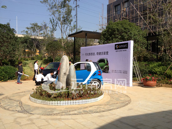 營銷中心前的空地上,中國水電金檀正聯(lián)合昆明興旗汽車有限公司做SMART的車站,凡是中國水電金檀WE客會的會員,在昆明興旗汽車有限公司購買SMART,即可享受萬元大禮包,其中包括全車貼膜、商業(yè)險、維修代金券等優(yōu)惠。