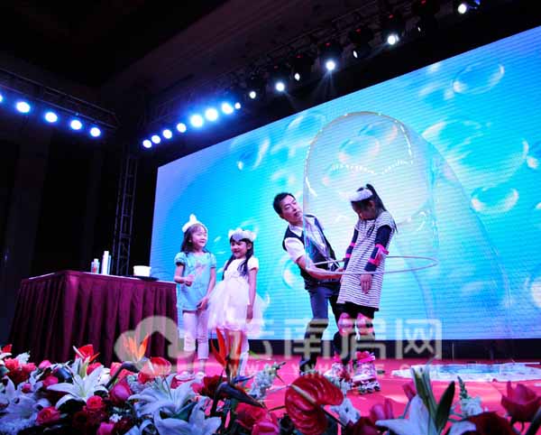 女主持人:第三個(gè)小美女上臺(tái)太神奇了,踩著滑輪就回家了。接下來讓我們拭目以待,我們的泡泡秀大師將要和我們的小朋友玩一個(gè)什么樣的互動(dòng)呢?