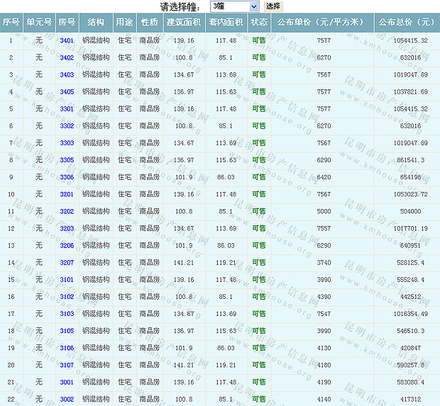 根據(jù)云南省物價(jià)局關(guān)于發(fā)布《云南省商品房銷售明碼標(biāo)價(jià)實(shí)施細(xì)則(試行)》的通知,現(xiàn)將該項(xiàng)目商品住房的準(zhǔn)售房源及每套房屋價(jià)格向社會(huì)公布,房地產(chǎn)開發(fā)企業(yè)應(yīng)嚴(yán)格按照公布價(jià)格,商品房銷售明碼標(biāo)價(jià)實(shí)行一套一標(biāo)。商品房經(jīng)營者應(yīng)當(dāng)對(duì)每套商品房按照建筑面具進(jìn)行明碼標(biāo)價(jià),否則,房產(chǎn)登記機(jī)關(guān)不予登記備案。準(zhǔn)售房源及房價(jià)信息如下: