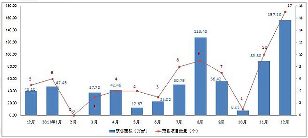 2011年12月房地產(chǎn)市場整體供應(yīng)157.10萬㎡,環(huán)比增長74.94%,同比去年12月,供應(yīng)面積增加了117.00萬㎡,同比增長291.77%。12月合計共有17個項目通過預(yù)售審批,物業(yè)類型包括:專業(yè)市場與車位各1個、商務(wù)項目2個以及住宅項目13個。其中北市區(qū)與中心區(qū)各有1個項目,東市區(qū)有2個項目,西市區(qū)有4個項目以及南市區(qū)有9個項目,北市、滇池、東南、東市、二環(huán)內(nèi)、高新、世博與西山板塊均有。