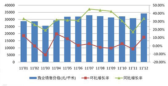 從商業(yè)價格指數(shù)來看,除2011年前幾個月稍有松動外,全年價格在大量新增商業(yè)入市的格局之下,保持了一個穩(wěn)中有升的發(fā)展態(tài)勢。