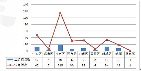 分板塊來看,二環(huán)內(nèi)板塊和東南板塊的項目12月份投放項目集中,廣告投放頻次偏多,報媒投放頻次分別是43次和96次,北市板塊的投放頻次明顯增多,總共投放了32次,主要是以新亞洲歡樂城的項目投放頻次占比較多,占到7%。