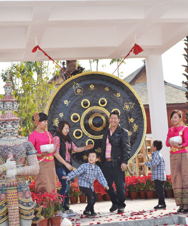 告莊西雙景為傣語(yǔ),漢意為“九塔十二寨”,旨在重現(xiàn)古時(shí)景洪盛景,打造一個(gè)繁華昌盛的“景洪城中之城”。其根植西雙版納傣族文化,融合大金三角、湄公河流域傣泰文化精華,締造前所未有的大金三角傣泰文明之心,引擎西雙版納旅游地產(chǎn),呈現(xiàn)文化體驗(yàn)之都、休閑度假之都、旅游商貿(mào)之都、國(guó)際商務(wù)之都、傣泰生活之都、時(shí)尚繁華之都,鑄就西雙版納城市新名片。由于項(xiàng)目一期大部分業(yè)主很多都是外省市的,為了讓每一位客戶都能感受到賓至如歸的接待,“告莊西雙景”交房項(xiàng)目組做了很多貼心服務(wù),如:所到業(yè)主均可享受專車接機(jī)服務(wù),并有機(jī)會(huì)免費(fèi)入住當(dāng)?shù)匚逍羌?jí)酒店“景蘭國(guó)際酒店”,交房現(xiàn)場(chǎng)更特別為業(yè)主準(zhǔn)備了大量的版納特色水果和甜點(diǎn)。更值得一提的是,時(shí)逢龍年新春之際,中國(guó)人都有討個(gè)“開(kāi)門(mén)紅,大彩頭”的習(xí)俗,“告莊西雙景”特別策劃舉行了極富“傣泰迎新”特色的——敲打“大型祈福铓”和“花瓣迎喜”這樣特殊的迎新形式來(lái)慶祝業(yè)主順利接房。每個(gè)業(yè)主在辦完交房手續(xù)后,由禮儀人員邀請(qǐng)擊響放置在“大金塔集會(huì)廣場(chǎng)”的“祈福铓”,同時(shí)還會(huì)有多名禮儀小姐向業(yè)主潑灑鮮花花瓣慶祝,所有的一切都預(yù)示著項(xiàng)目即將迎來(lái)火熱的人氣。交房現(xiàn)場(chǎng)氣氛異常熱烈,很多業(yè)主都是第一次見(jiàn)過(guò)這么大型的“祈福铓”,紛紛留影紀(jì)念這一特殊的時(shí)刻。