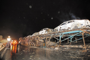 這時,消防員趕到。他們立即用高壓水槍對著大卡車噴水。最后,大卡車車頭和靠近車頭的3輛新車保住,其他新車及掛車全部被燒毀——16輛新車被燒成空架子。