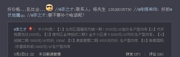 此外,由榮城地產(chǎn)分銷的欣都龍城是8000元左右的均價,轉(zhuǎn)讓費3.2萬,戶型面積僅有60平米的了,目前僅剩7、8套房源了。而未開盤就團購轉(zhuǎn)讓的房源也有很多,如微博上@李之才發(fā)表中介叫賣一手樓盤創(chuàng)收益的信息:“【1】北市區(qū)國,F(xiàn)代城一期:6700元/㎡起價各戶型均有【2】代開稅票包過1800元!3】南市區(qū)金坤世紀(jì)二期(金牛小區(qū)旁)6000元/㎡均價各戶型均有!4】潤城二期:5800元/㎡均價,100㎡.【5】奧宸橙郡二期:6550元均價,各戶型均有.【6】新都國際:(東盟森林前)4800元/㎡各戶型均有,聯(lián)系人楊先生13529035730”。