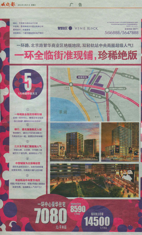 獨(dú)立臨街商鋪14500元/㎡起,是環(huán)城北路邊葡萄街區(qū)遍殺全城的價(jià)格。根據(jù)至祥的研究數(shù)據(jù),昆明2月份商鋪均價(jià)34539元/平方米,其中按商業(yè)業(yè)態(tài)劃分,2月商業(yè)街類型的商鋪均價(jià)23625元/平方米,社區(qū)商業(yè)均價(jià)31660元/平方米。云南房網(wǎng)查看了一下數(shù)據(jù),目前還有售的新亞洲體育城商鋪價(jià)格均價(jià)23000元;位于滇池路與廣福路交叉路口的中央金座,現(xiàn)有20-60平方米的商鋪在售,均價(jià)在50000元/平方米左右;萬(wàn)科香緹坊商業(yè)廣場(chǎng)元旦認(rèn)籌時(shí)候,商鋪面積30-507平方米,價(jià)格1.5萬(wàn)元/平方米起;云上城商鋪去年12月24日開盤40席商鋪,價(jià)格1.5萬(wàn)元/平方米起……通過這些價(jià)格對(duì)比,可以看出葡萄街區(qū)的獨(dú)立臨街商鋪價(jià)格,非常具有優(yōu)勢(shì)。