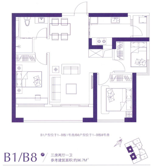 96.7平米的B1、B8戶型也為三室兩廳一衛(wèi),分布于1-B棟1號房和8號房,均為西南朝向。此戶型雖為明廚明衛(wèi)設計,洗漱間分離,但衛(wèi)生間與餐廳僅一墻之隔,設計有些不合理,餐廳與客廳間有一條過道,不好擺放家具,次臥與主臥之間的空間浪費很明顯,愜意的是書房與客廳外的超長景觀陽臺。