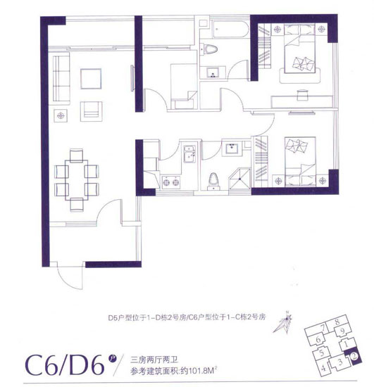101.8平米的C6、D6與104.9平米的C4、D4戶型,均為三室兩廳兩衛(wèi)的戶型,二者功能區(qū)設計基本一致,方向、朝向相反,入戶花廳面積稍有差異:C6、D6戶型分布于1-D棟2號房和1-C棟2號房,為東南朝向戶型;C4、D4分別位于1-D棟4號房和1-C棟4號房,為西南朝向。C6、D6的入戶花廳很齊整,好規(guī)劃,利用率高。C4、D4入戶花廳則是過道式的,可放置鞋柜等物品,除此之外,兩個戶型的動能區(qū)間是一致的,入戶門與餐廳、客廳及陽臺在同一平面,有利于通風透氣,主臥衛(wèi)生間與公衛(wèi)相對,廚房與書房相對又都有自己的陽臺,功能區(qū)分明顯,基本無浪費空間,且所有房間都能采光,值得考慮。
