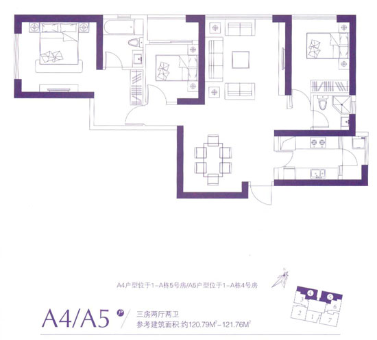 120.79平米——121.76平米A4、A5戶型分布于1-A棟的4號(hào)、5號(hào)房,為三室兩廳兩衛(wèi)設(shè)計(jì),分別為西南和東南朝向。此戶型進(jìn)門的左側(cè)為餐桌,右側(cè)為廚房客廳與次臥在同側(cè),公衛(wèi)在房間的東南角,動(dòng)靜功能區(qū)的區(qū)分明顯,主臥闊綽,明廚明衛(wèi),可以列入?yún)⒖紤粜偷姆秶?/p>