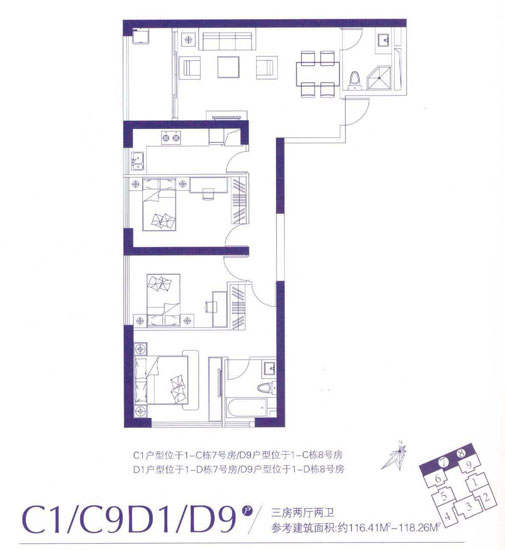116.41平米——118.26平米的C1、C9和D1、D9的戶型都為三室兩廳兩衛(wèi)設(shè)計(jì),C1、C9戶型分別位于1-C棟7號(hào)、8號(hào)房;D1、D9戶型分別為以1-D棟7號(hào)、8號(hào)房,為西南和東南兩個(gè)朝向的房源。此戶型呈“L”型,雖是明廚明衛(wèi)設(shè)計(jì),功能區(qū)分也很明顯,但整體感覺(jué)像公寓,尤其是主臥、次臥、書(shū)房、廚房之間的大過(guò)道更是無(wú)形中影響了美觀,優(yōu)點(diǎn)在于都是端頭房,入戶門與景觀陽(yáng)臺(tái)相對(duì)采光采陽(yáng)不受影響。
