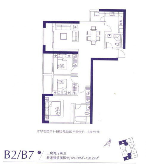 124.38平米——128.27平米的B2、B7戶型為三室兩廳兩衛(wèi),分別位于1-B棟2號(hào)和7號(hào)房,均為西南朝向。此戶型入戶花廳較長(zhǎng)可設(shè)計(jì)一個(gè)玄關(guān),雖也有116.41平米——118.26平米戶型中主臥、次臥、書(shū)房間大過(guò)道的缺陷,但整體而言,動(dòng)靜區(qū)分較為明顯,生活、起居獨(dú)立分開(kāi)、互不影響。