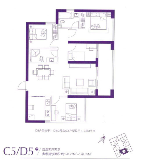 128.27平米——128.32平米的C5、D5戶型分布于1-D棟3號(hào)房和1-C棟3號(hào)房,為四室兩廳兩衛(wèi)、東南朝向設(shè)計(jì)。此戶型由于面積大,功能區(qū)的分布易設(shè)計(jì),兼具了主臥寬綽、客廳與書(shū)房外有連通的超大景觀陽(yáng)臺(tái)、有獨(dú)立洗衣房以及空間利用合理的特點(diǎn),但該戶型同時(shí)也有公衛(wèi)無(wú)窗戶且在餐廳旁的缺點(diǎn)。