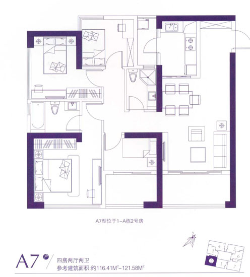 116.41平米——121.58平米的A7戶型位于1-A棟2號(hào)房,為四室兩廳兩衛(wèi)、西南朝向設(shè)計(jì)。此戶型較為方正,戶型設(shè)計(jì)合理,浪費(fèi)空間小,動(dòng)靜區(qū)分明顯,景觀陽(yáng)臺(tái)超大,但公衛(wèi)也無(wú)窗戶。
