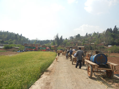 下午4時,送水車隊將水運至大沖村頭便因路面狹窄、坡陡而不得再繼續(xù)前行,村民聽到消息,自發(fā)組成了“小馬車隊”前來運水,小馬車上,綁著汽油桶,一個汽油桶大概能裝10桶水!斑@樣一車水夠每戶人家用最多半月!