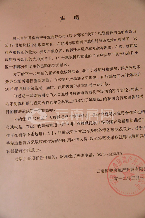 為確保17號片區(qū)廣大被拆遷戶能按時回遷,并維護我司及我司合作單位的合法權益,在此,我司鄭重通告并聲明:金坤世紀項目各項建設及銷售前準備工作正在有條不紊地進行當中,目前我司日常運作及財務等各項狀況良好。對于那些制造謠言及采取過激行為的、別有用心的人員,我司將堅決采取法律手段和其他有效措施予以反擊。