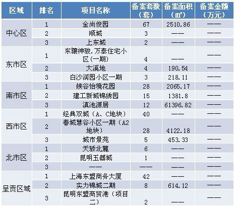 本周各區(qū)域房地產(chǎn)市場交易套數(shù)三強:本周備案前三強分別位于中心區(qū)、呈貢與西市區(qū),排名先后順序為:金尚俊園、上海東盟商務(wù)大廈以及經(jīng)典雙城(A、C地塊)。