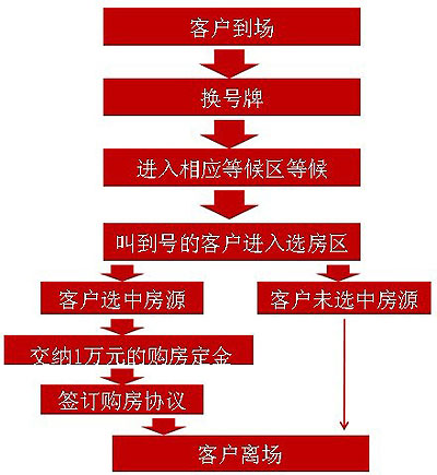 客戶通過認(rèn)籌卡顏色及發(fā)放順序,由現(xiàn)場(chǎng)主持人叫號(hào)分批進(jìn)入選房區(qū)選房,成功后簽訂認(rèn)購協(xié)議,領(lǐng)取禮品退場(chǎng)。