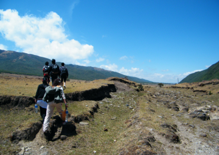 一個(gè)半小時(shí)后,我們到達(dá)了第一個(gè)埡口。休息時(shí),陽(yáng)光拿著棍子在地上畫(huà)著箭頭,給后面出發(fā)得晚的家明等人做記號(hào),這里如果走岔了,就走不到花甸壩了,畫(huà)完在邊上寫(xiě)上“家明小子”四字,家明的“家”字頂上一點(diǎn)挑了一塊風(fēng)干的牛糞代替,一群人這才嘻嘻哈哈地走了。