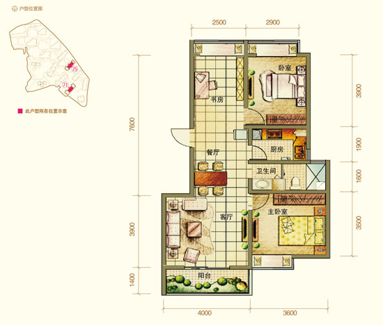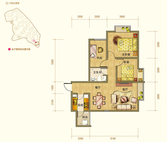 此戶型分布在每層樓的中間位置,在客廳與書房之間開門,進門后書房、餐廳與客廳連成一體,客廳外有一個5.6米的景觀陽臺可與書房的飄窗形成很好的空氣對流。且主臥室、次臥、書房都有各自的飄窗,既美觀又有利于人體健康,主臥室面積約11.31平米,可放置2米左右的雙人床及衣柜等物品。此戶型唯一的缺點在于廚房的窗戶很小,通風和光線都會受到一定影響。