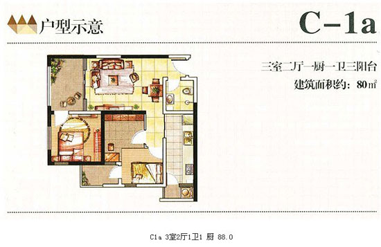 80平米的C—1a的戶型為3室2廳1衛(wèi)3陽臺設(shè)計(jì),戶型較78平米戶型稍好。此戶型的內(nèi)部結(jié)構(gòu)與78平米的戶型設(shè)計(jì)大同小異。從戶型圖上看,次臥與主臥的采光都不錯,廚房與衛(wèi)生間也獨(dú)立開了,有點(diǎn)還在于餐廳、客廳、生活陽臺緊密相連,更顯寬敞。不過78平米與80平米的戶型給人的感覺都是書房比次臥室大,需要加以改造。對于剛需來說,也可考慮出手。
