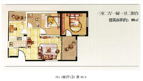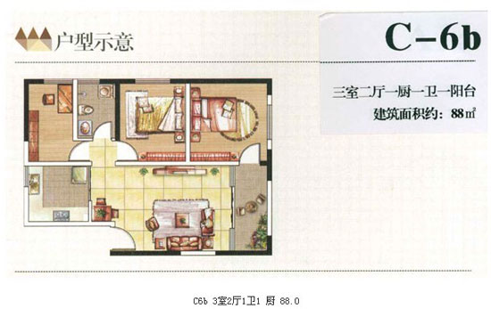 88平米的C—6b的戶型為3室2廳1衛(wèi)1陽臺設(shè)計(jì),該戶型雖然只有一個大的景觀陽臺,但戶型的整體設(shè)計(jì)較為合理,動靜區(qū)分明顯,廚房、餐廳、客廳與景觀陽臺在同一平面內(nèi),既符合人們?nèi)粘I畹男枨笠沧尶臻g顯得開闊大氣。明廚明衛(wèi)的設(shè)計(jì)讓通風(fēng)和采光都不必?fù)?dān)憂。唯一的缺陷在于沒有晾曬衣服的生活陽臺。