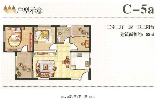 88平米的C—5a的戶型為3室2廳1衛(wèi)2陽臺設(shè)計(jì),該戶型設(shè)計(jì)方正、動靜區(qū)分明顯,布局合理。景觀陽臺與客廳、餐廳三位一體,空間充裕,明廚明衛(wèi)設(shè)計(jì),給人的感覺很舒適。生活陽臺與書房相連,無形中增大了書房的利用率,可在此處預(yù)留一個擺放洗衣機(jī)和晾衣服的空間,也可養(yǎng)些花花草草凈化空氣,而進(jìn)口處看似浪費(fèi)的空間可以放一個鞋柜。