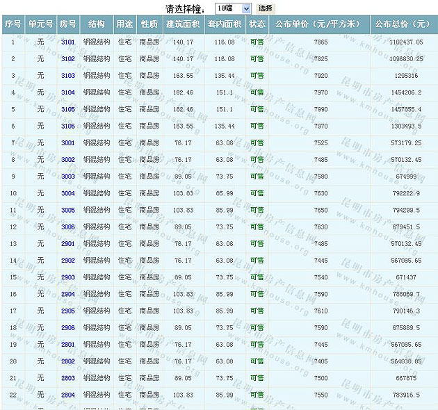 根據(jù)云南省物價(jià)局關(guān)于發(fā)布《云南省商品房銷(xiāo)售明碼標(biāo)價(jià)實(shí)施細(xì)則(試行)》的通知,現(xiàn)將該項(xiàng)目商品住房的準(zhǔn)售房源及每套房屋價(jià)格向社會(huì)公布,房地產(chǎn)開(kāi)發(fā)企業(yè)應(yīng)嚴(yán)格按照公布價(jià)格,商品房銷(xiāo)售明碼標(biāo)價(jià)實(shí)行一套一標(biāo)。商品房經(jīng)營(yíng)者應(yīng)當(dāng)對(duì)每套商品房按照建筑面具進(jìn)行明碼標(biāo)價(jià),否則,房產(chǎn)登記機(jī)關(guān)不予登記備案。準(zhǔn)售房源及房?jī)r(jià)信息如下: