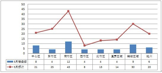 從投放項(xiàng)目來(lái)看,5月份投放頻次主要集中在南市區(qū)和呈貢區(qū)域上,分別有43次和30次,昆明主城區(qū)西市區(qū)的投放頻次最少,共投放8次,5月份項(xiàng)目投放頻次比4月項(xiàng)目投放頻次減少。