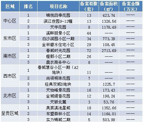 本周各區(qū)域房地產(chǎn)市場(chǎng)交易套數(shù)三強(qiáng):本周備案前三強(qiáng)分別位于南市區(qū)與東市區(qū),排名先后順序?yàn)椋捍撼菚r(shí)光花園、溪畔麗景小區(qū)和白沙潤(rùn)園小區(qū)一期。注:由于備案系統(tǒng)未公布成交金額,故備案金額暫時(shí)空白。