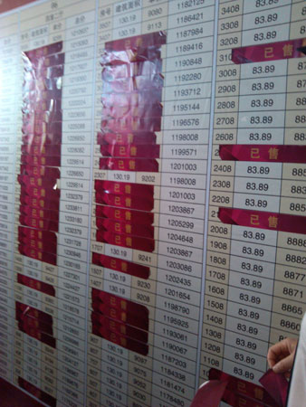 開盤20分鐘后,云南房網(wǎng)來到選房區(qū)。選房區(qū)的氣氛非常緊張,每組客戶僅有1分鐘的考慮時間,130.19平米的四室房源及87平米的三室房源最受歡迎,基本靠“搶”,貼條工作人員非常忙碌,置業(yè)顧問基本是跑步工作的,選了一組又忙著接待下一組。一位客戶在看了房子,又給家人打電話詢問后,再一看,看中的房源已經(jīng)貼上“已售”了。
