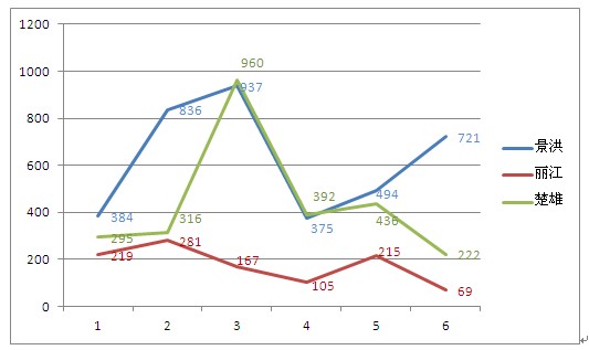 在該折線圖上,2012年上半年內(nèi),楚雄前三個(gè)月的月成交套數(shù)均處于上升階段,尤其3月份累計(jì)成交960套商品房,環(huán)比增長(zhǎng)644套,成交量翻了3番。但好景不長(zhǎng),4月份,楚雄累計(jì)成交商品房392套,環(huán)比減少568套,跌幅為59.16%。雖然其中3天由于楚雄信息網(wǎng)出現(xiàn)故障成交數(shù)據(jù)缺失,但該月楚雄也有8天出現(xiàn)了0成交。