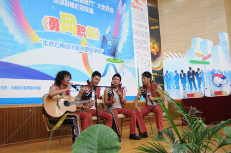 來自瀘沽湖的摩梭小伙蔣玉華,是中國視頻招聘在線的創(chuàng)始人兼CEO,他的視頻招聘網(wǎng)站已上線兩年,最近,憑借其在云南各高校巡回舉行的反響熱烈的《勇網(wǎng)職前》欄目,令人對他這一新鮮的招聘生意產(chǎn)生無限遐想。
